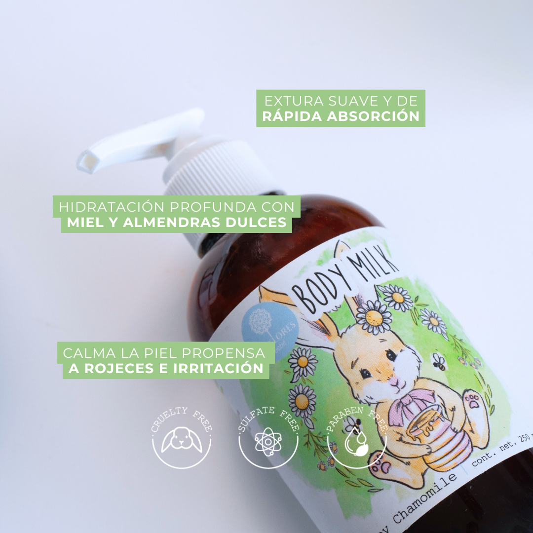 Nuestra crema para cuerpo Honey Chamomile está formulada con mantecas y aceites vegetales, extracto de manzanilla, caléndula y aceite de almendras dulces para hidratar y proteger la piel delicada del bebé.
